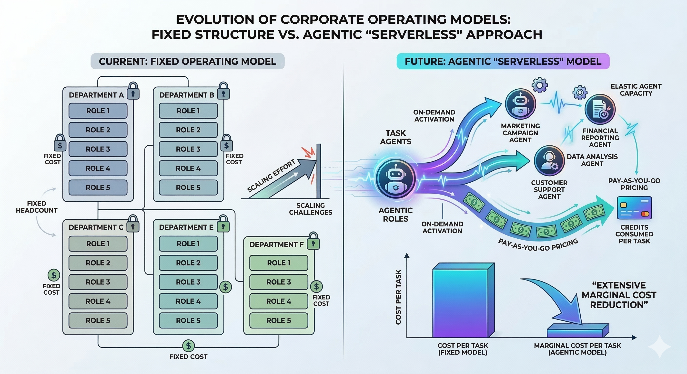GenAI introduces “Serverless Cognition.” Instead of carrying a heavy fixed cost for routine, repetitive tasks, companies can call upon an AI agent to execute a workflow—such as translating legacy code, QA testing, or analyzing a spreadsheet—and they only pay for the API call. This elasticity allows an organization to scale its intellectual output up or down instantly, radically lowering the baseline cost of running a business.